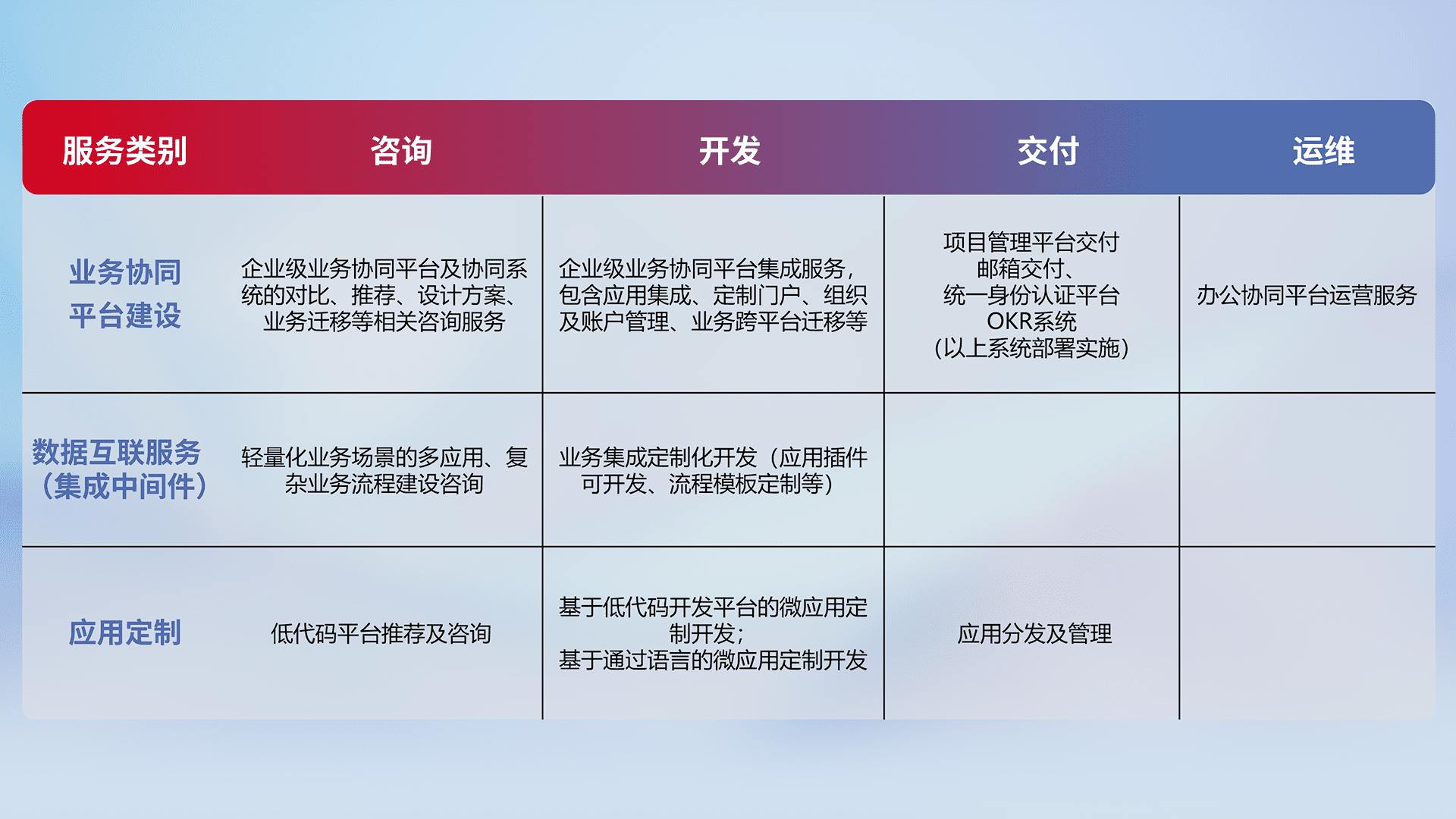 针对钉钉、、企微、、IDaas等平台级产品提供产品的规划、、、、方案、、、交付、、、定制化开发等服务,,,,实现如统一协同办公、、、、智能客户服务、、混合会议管理、、智能数据查询、、、等业务场景,,实现数字化转型。。。