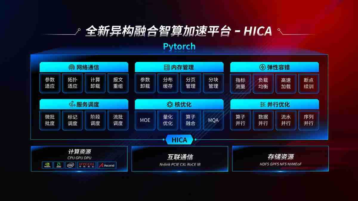通过自研的服务层、、、、中间适配层、、、、以及调度编排算法,,,,采用数据并行、、、模型并行等多种并行方式,,把并行计算任务进行有效的分解,,使其分别由相应的软件栈和算力资源来承接。。当GPU资源变化,,,,HICA可以实时动态调度计算子任务并调整模型拓扑和架构,,,以充分聚合各种算力资源。。。。