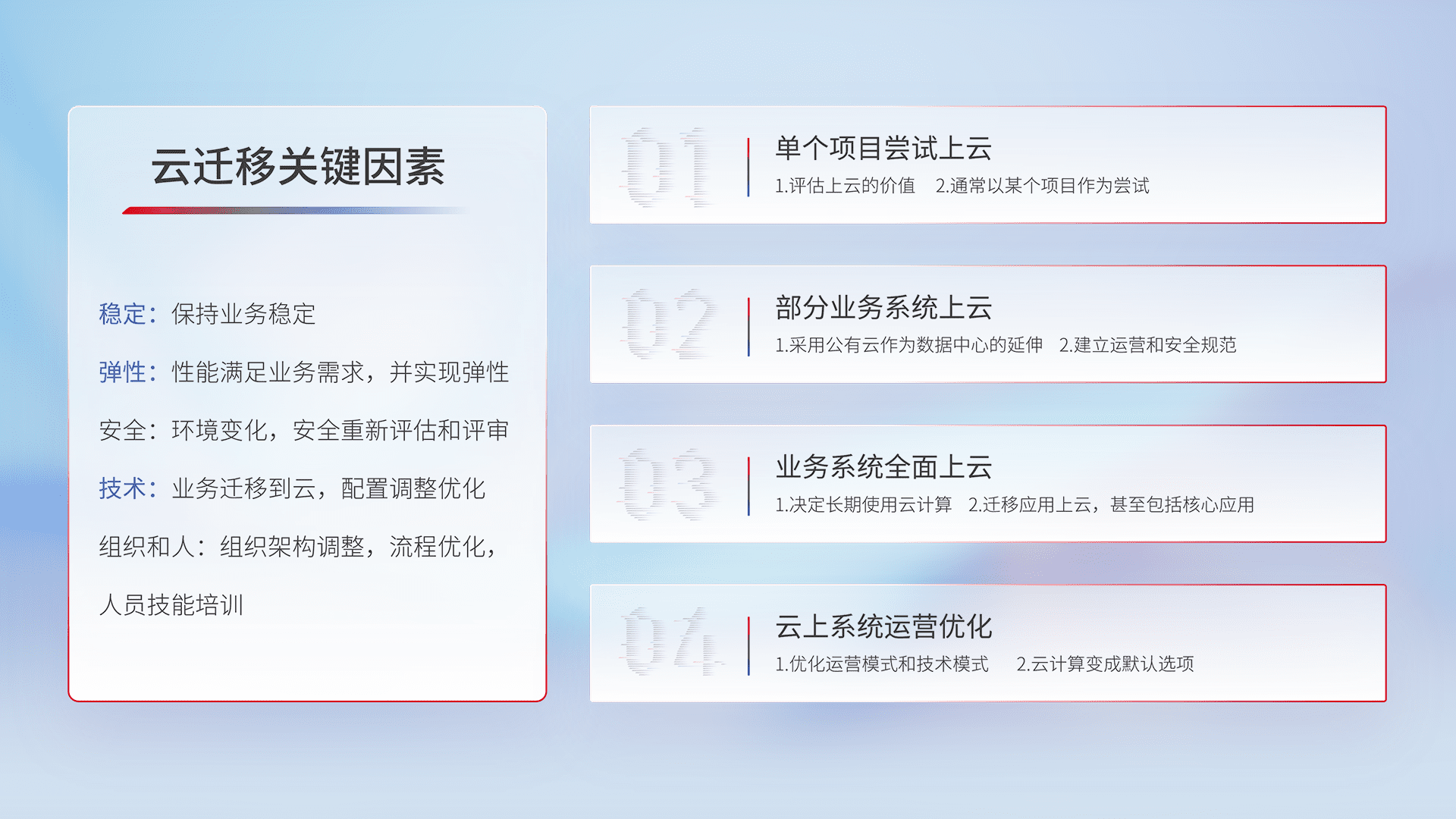 结合实际业务,,,,从规划设计、、云平台选型、、、、云原生改造、、数据迁移、、、集成交付,,迁移全过程为客户识别最佳上云路径,,,,做好风险识别管理,,,设计网络架构、、身份权限、、安全审计合规、、、、操作审计、、、日志审计、、、监控告警策略、、多站点容灾设计等,,,,对云上基础设施进行整体规划,,提升IT治理水平,,,以满足弹性、、、、高可用、、、、高性能的需求。。。。