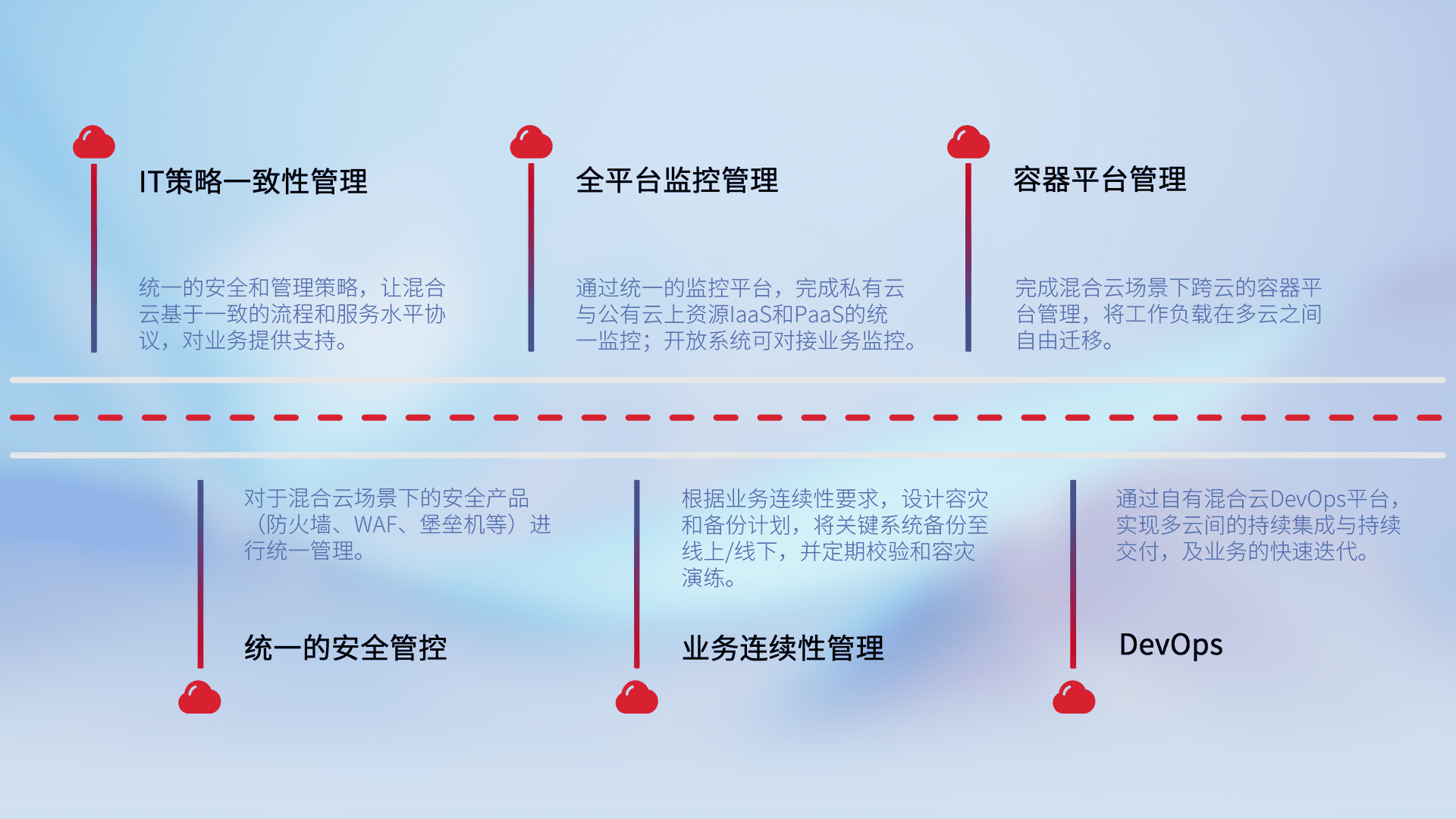 通过多云纳管,,,以统一的资源数据模型把客户的云资源进行抽象和封装,,,,进而实现对多云资源的统一操作,,,,保障云资源管理的可靠性、、稳定性与可用性。。。。量身定制化运维内容,,配置、、、开发运维、、、、补丁管理、、、、备份、、监控、、认证和访问管理、、审计和日常巡检等,,,保障在用云过程中的可靠度,,稳定度以及高可用率。。。。