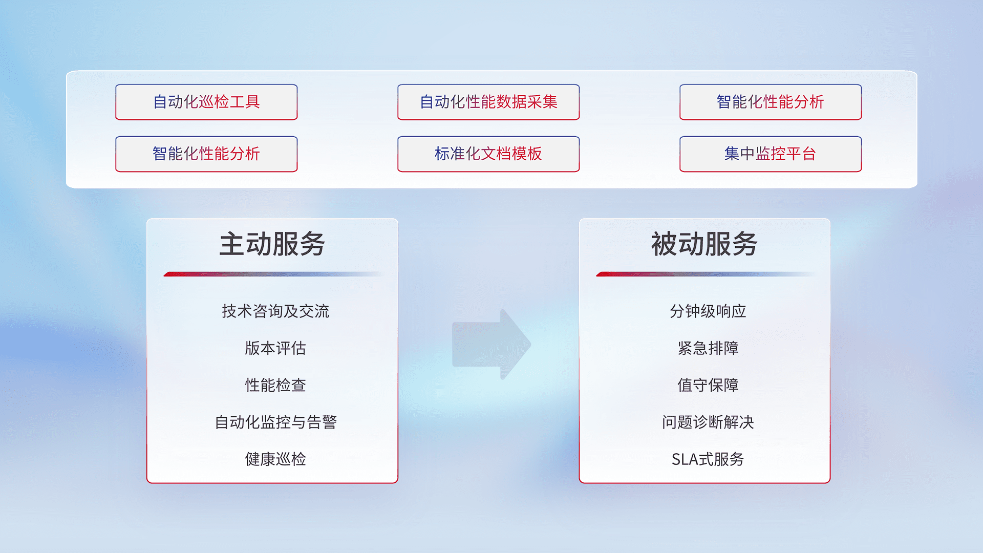 智能化工具和标准化文档,,保障服务质量,,,提供主动服务(包含技术咨询、、版本评估、、、性能检查、、、自动化监控与告警、、、、健康巡检)和被动服务包含(分钟级响应、、紧急排障、、、值守保障、、问题诊断解决、、SLA服务)。。